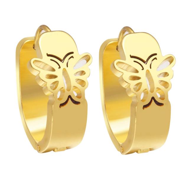 少し楕円形の大きめのゴールドフープピアスのトップに蝶々をデザインしたフープピアス。結婚式やパーティースタイルにオススメのステンレスピアス。