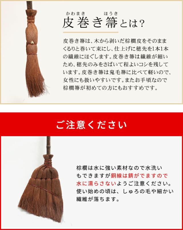 | 畳み掃に最適。和歌山県 紀州伝統デザイン皮巻き棕櫚箒。 棕櫚箒は数百年の歴史があるといわれる日本の伝統的な箒で、和箒の中でも棕櫚箒は耐久年数が長く、丈夫で長持ちするといわれています。 人目に触れても見苦しくないので、いつでも気軽に手にとれる場所に吊るして置けます。 電気掃除機のようにとは違ってエコで音も静かな棕櫚箒。 畳にもフローリングにも適した箒です。 棕櫚(シュロ)とは 里山では普通に見ることのできるヤシ科の常緑植物です。 幹の周りの皮を編んで作られる棕櫚縄、棕櫚マットなどがあるように繊維はしなやかで非常に丈夫です。 タワシ等にも使われる素材ですから水にも強いという特徴を持っています。 皮巻き箒は、木から剥いだ棕櫚皮をそのままくるりと巻いて束にし、仕上げに穂先を 1本1本の繊維にほぐします。 皮巻き箒は繊維が細いため、穂先のみをさばいて程よいコシを残しています。 皮巻き箒は鬼毛箒に比べて軽いので、女性にも扱いやすいです。 またお手頃なので棕櫚箒が初めての方にもおすすめです。 棕櫚は水に強い素材なので水洗いもできますが銅線は錆がでますので水に濡らさないようご注意ください。 使い始めの頃は、しゅろの毛や細かい繊維が落ちます。 |