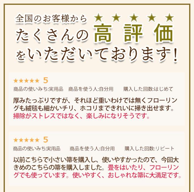 - ちゃんとした箒が欲しくて色々探していました。 安くなったタイミングで購入させて頂き、昨日届きました。 届いてから早速使ってみました。 思いの外、使い勝手が良かったです。 最初はポロポロ粉が出るとの事だ...