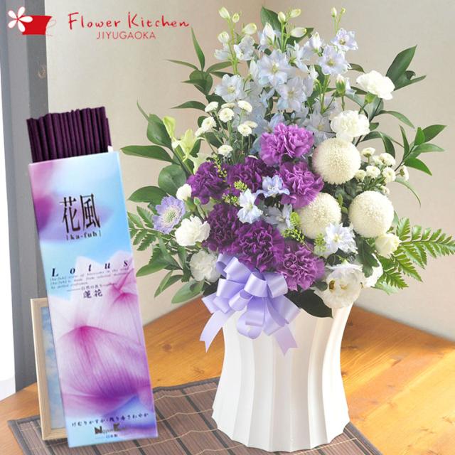 お花とお線香セット ムーンダスト供花アレンジLサイズ+線香 花風ロータス蓮花 お供え お悔み 法事 命日 お彼岸 フラワーギフト メッセージカード FKAASE