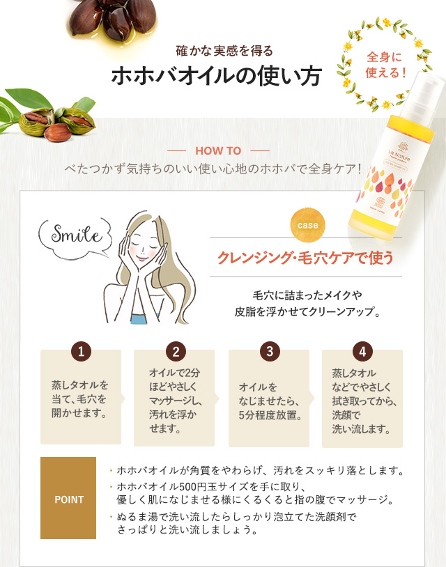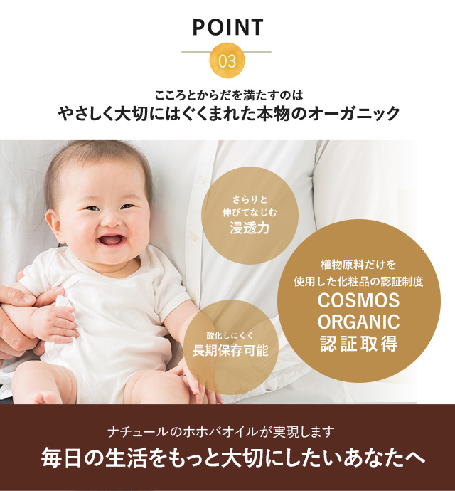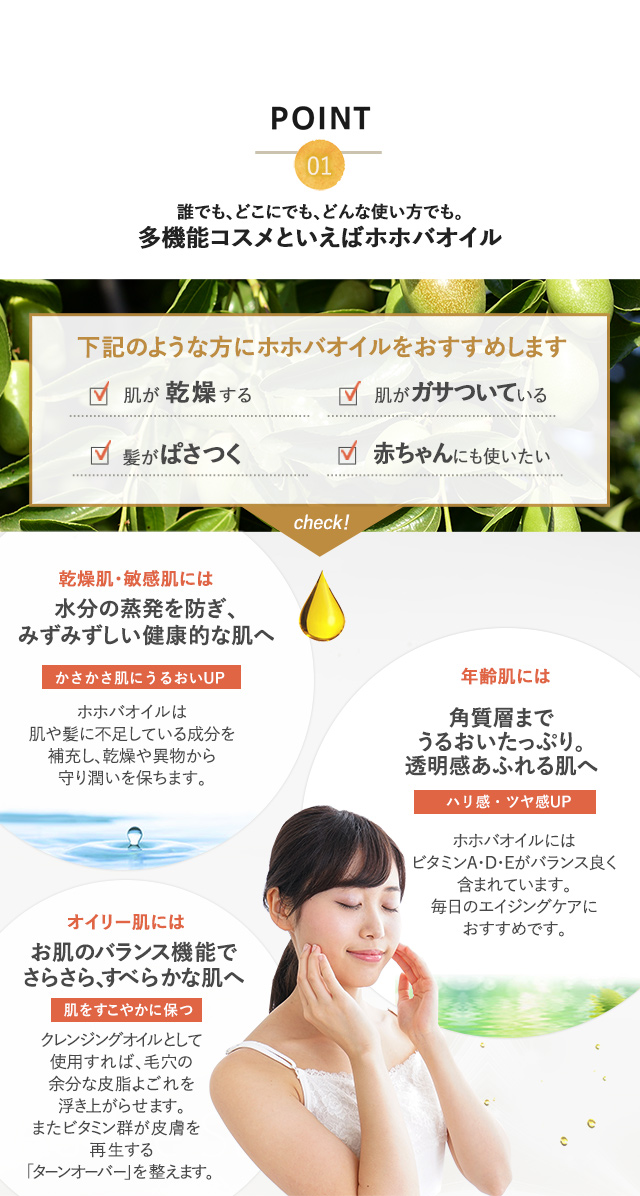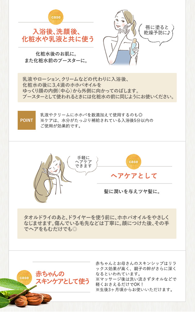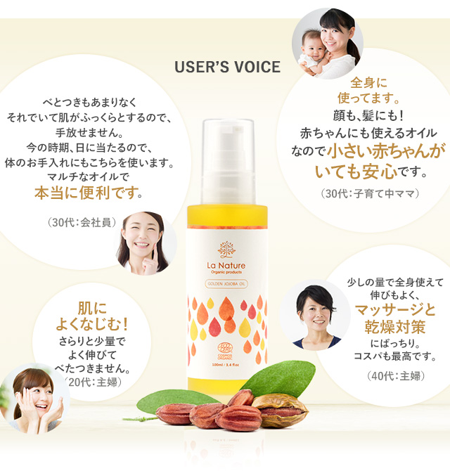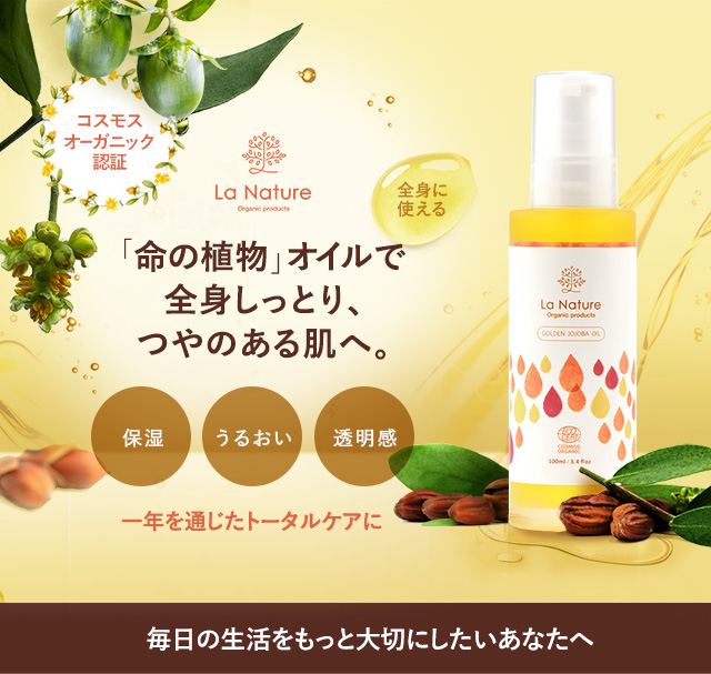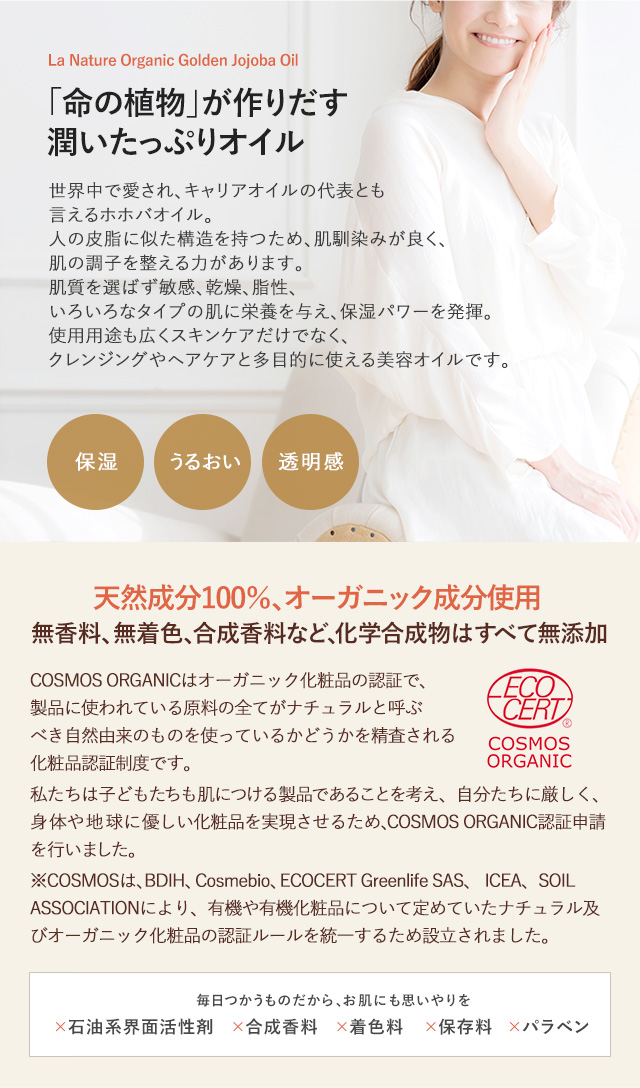 【原材料】成分:ホホバ種子油(100% 天然由来、オーガニック原料を使用)