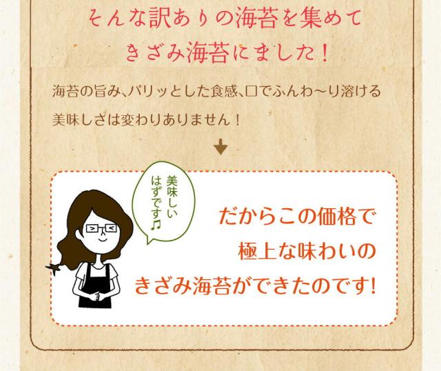 - 以前購入して美味しかったので再購入です。スーパーで買うきざみ海苔よりとても美味しいのと沢山入っているので重宝してます。 注文ナンバー739660829