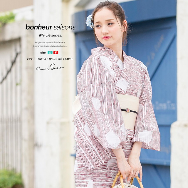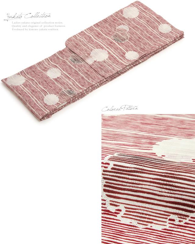 浴衣セット レディース レトロ 浴衣セット 大人 3点セット 赤 レッド 白 クリーム 雪輪 横縞 綿 変わり織 夏祭り 花火大会 半幅帯 女性 ボヌールセゾン S フリー