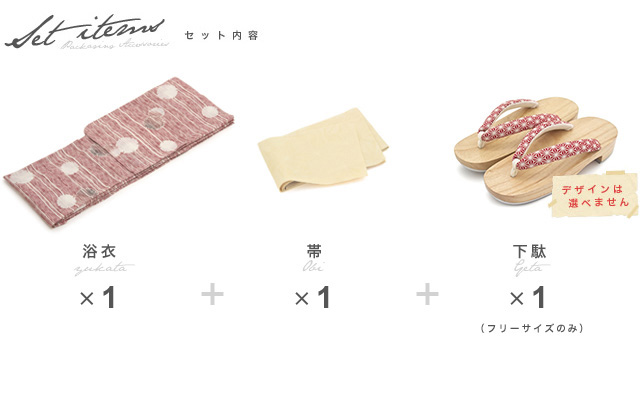 こちらの商品は、浴衣・帯・下駄の3点セットです。セット内容の一部変更や、それに伴う値引きは承っておりません。