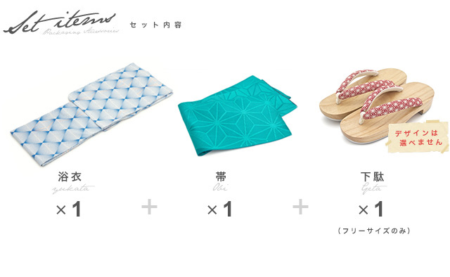 こちらの商品は、浴衣・帯・下駄の3点セットです。セット内容の一部変更や、それに伴う値引きは承っておりません。