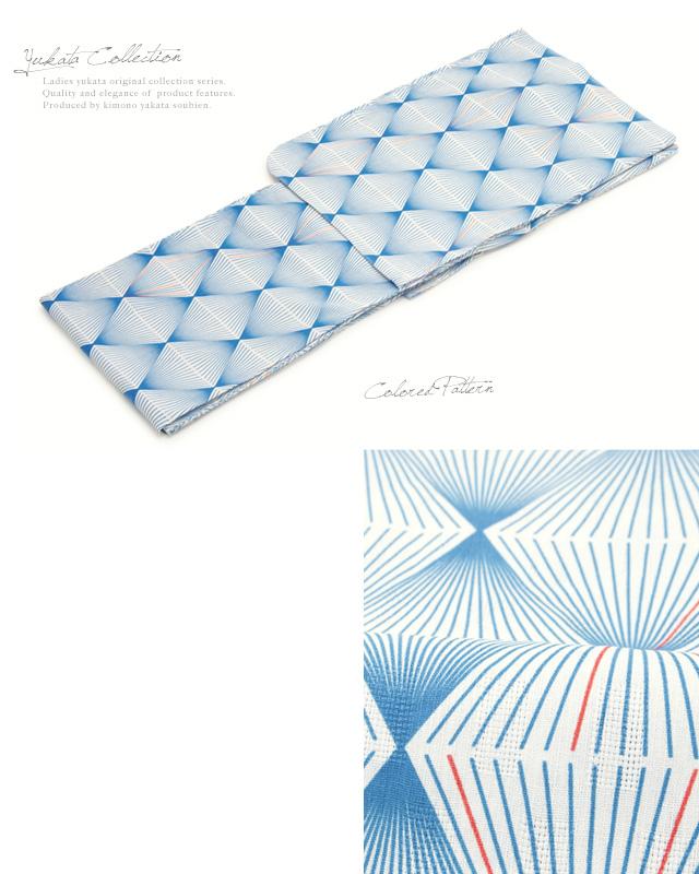 浴衣セット レディース レトロ 浴衣セット 大人 3点セット 青 ブルー 白 緑系 幾何学模様 菱 綿 アートモダン 変わり織 夏祭り 花火大会 半幅帯 女性 ボヌールセゾン S フリー