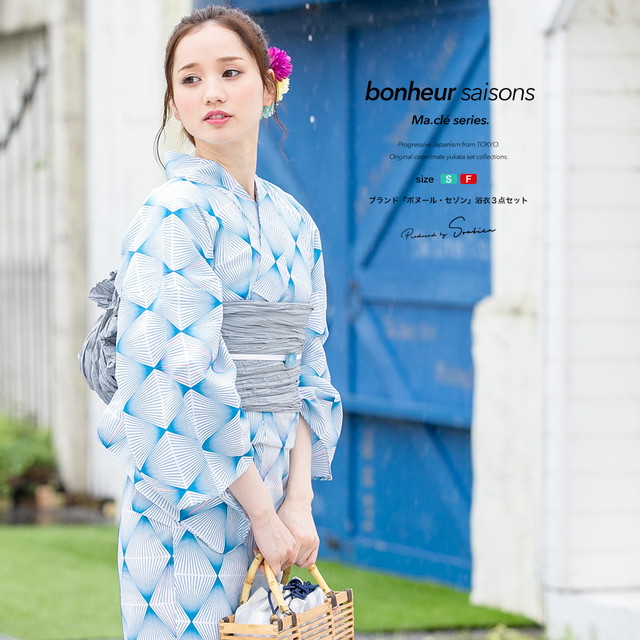 浴衣セット レディース レトロ 浴衣セット 大人 3点セット 青 ブルー グレー 幾何学模様 菱 綿 アートモダン 変わり織 夏祭り 花火大会 兵児帯 女性 ボヌールセゾン S フリー