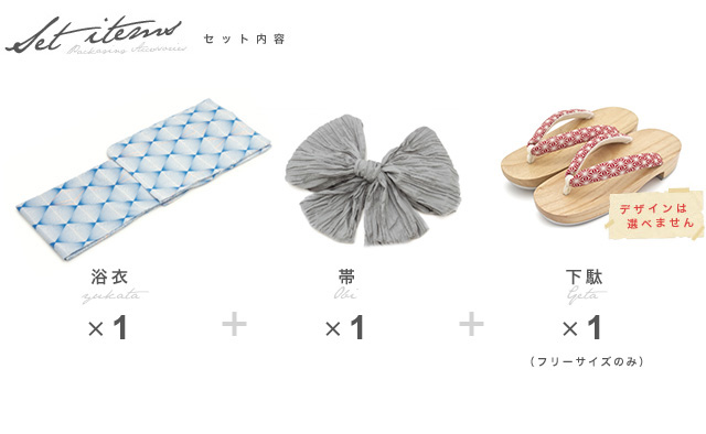 こちらの商品は、浴衣・帯・下駄の3点セットです。セット内容の一部変更や、それに伴う値引きは承っておりません。