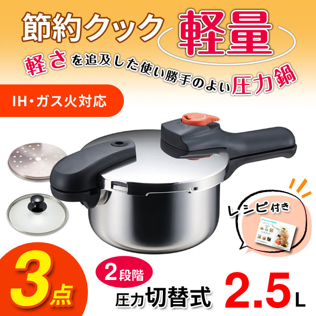 圧力鍋 3点セット 2.5L ih 対応 片手圧力なべ ガス火OK ステンレス製 おすすめ セット レシピ本 ガラス蓋 蒸し目皿付 圧力切替式 2.5リットル 18cm 4合炊き パール金属