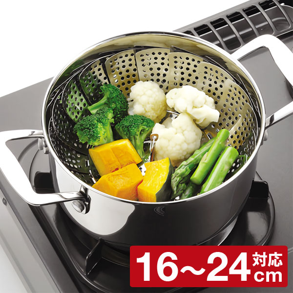 | 16〜24cmのお鍋に合わせて大きさが変えられる万能蒸し器です。 リング付きなので蒸し上がった料理が型崩れなく、菜箸で取り出せます。 | |