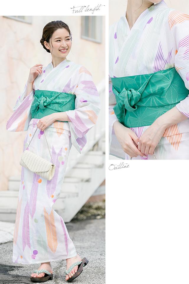 浴衣セット レディース レトロ 浴衣セット 大人 3点セット 白系 ホワイト カラフル 緑系 矢羽根 縞 水玉 ラメ 綿 紅梅織 半幅帯 女性 ボヌールセゾン フリー