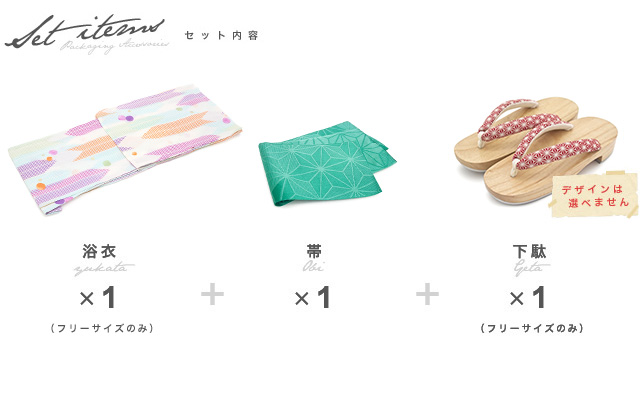 こちらの商品は、浴衣・帯・下駄の3点セットです。セット内容の一部変更や、それに伴う値引きは承っておりません。