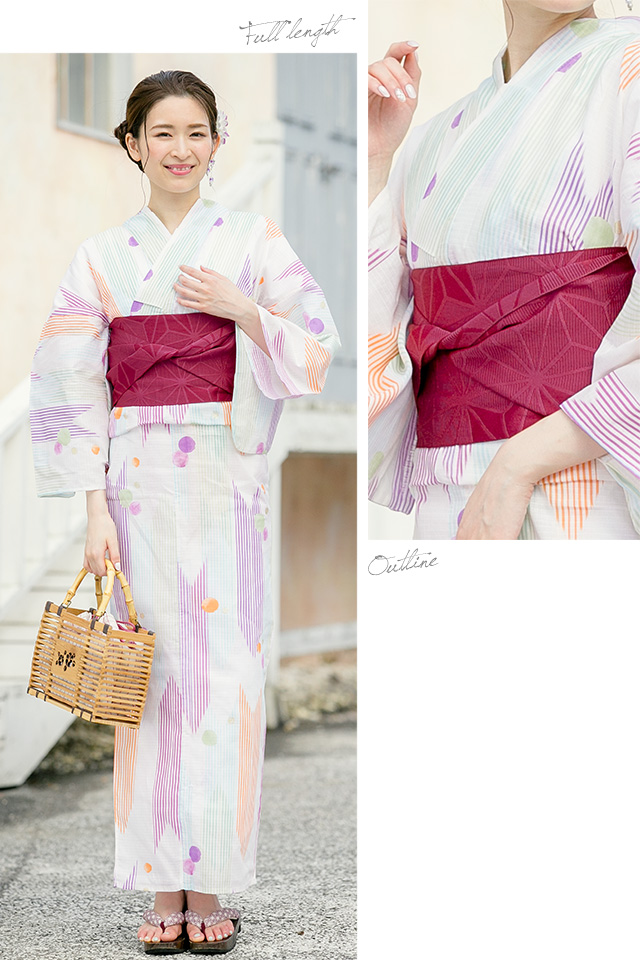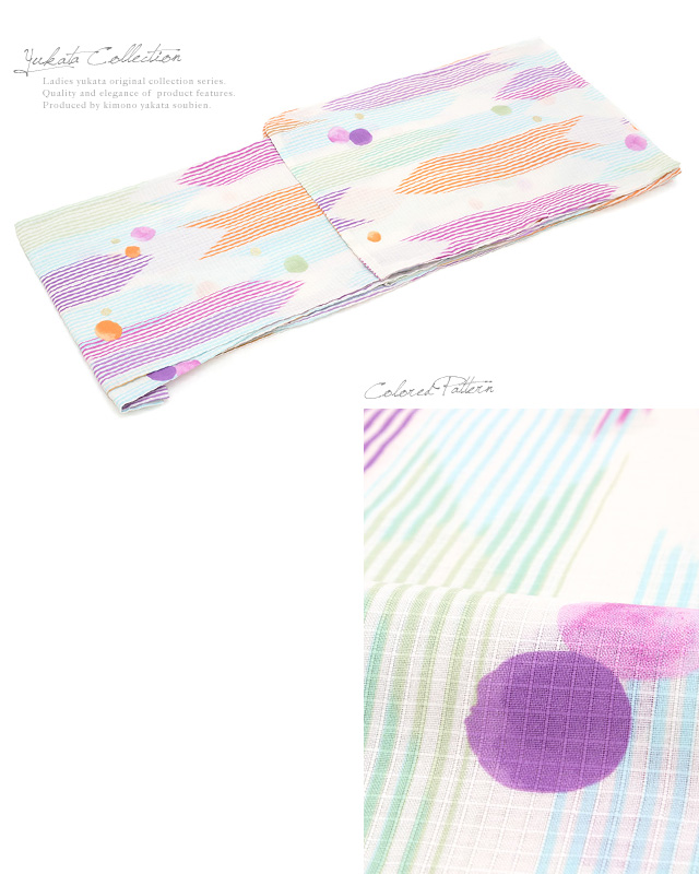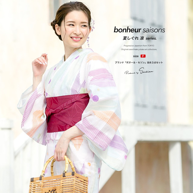 浴衣セット レディース レトロ 浴衣セット 大人 3点セット 白系 ホワイト カラフル 紫系 矢羽根 縞 水玉 ラメ 綿 紅梅織 半幅帯 女性 ボヌールセゾン フリー