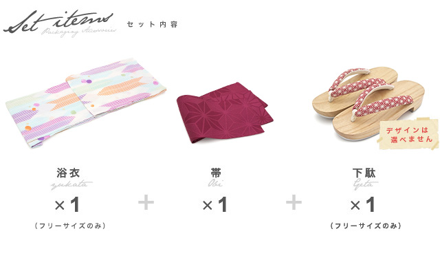 こちらの商品は、浴衣・帯・下駄の3点セットです。セット内容の一部変更や、それに伴う値引きは承っておりません。