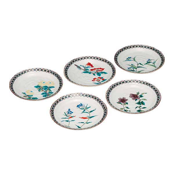 「送料無料」 九谷焼 皿揃 金欄小紋五草花 6号 5枚セット ( 退職祝い 定年 プレート おつまみ 料理 和食 洋食 九谷焼 結婚 出産 内祝い )