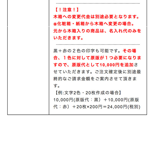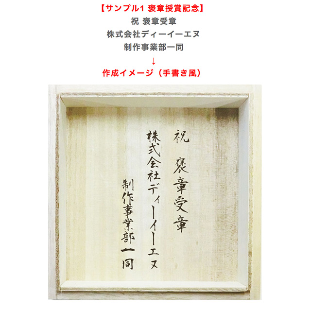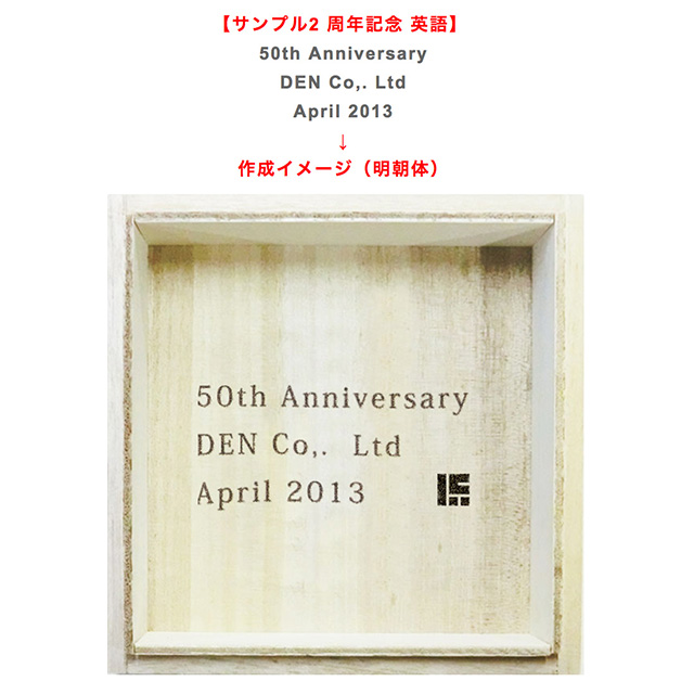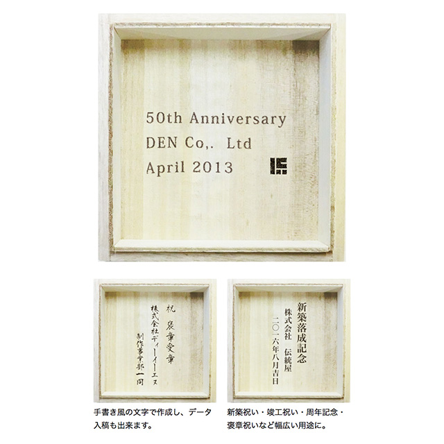 版を作り大量に印刷が可能です。記念品、ノベルティなど大量注文でご利用のお客様に最適な木箱の蓋裏への名入れサービスです。※原版作成代のみでは印字出来ません。個数分の印字代とご一緒にご注文ください。