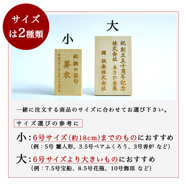 当店の中で一番早く仕上がる、高級感のある名入れ用デザイン木札。記念品の名入れはもちろん、自社の一押しポイントを木札で表現して、販促にお使いいただくことできます。※当店の置物や飾り皿などの商品とご一緒にご注文ください。(※木札のみの購入をご希望の場合は【単品購入専用】の木札販売ページよりご購入下さいませ。)