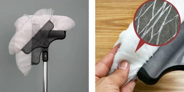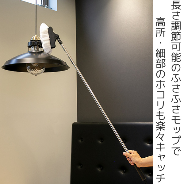 | ヘッドの角度は5段階 ヘッドは5段階で左右への調節が可能です。照明など、高いところの上部も角度を付けることでお掃除しやすくなっています。 | ふさふさの網目状モップ モップはポリプロピレン製です。一本一本が網状になっていてホコリを絡めとります。高いところ・細いすき間のホコリも、優しくなでるだけで簡単にキャッチします。 |