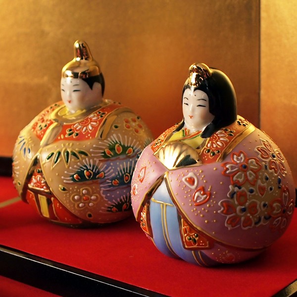 陶器で作られたのころんと丸い形の雛人形は和室洋室問わず、省スペースで現代の生活に調和してくれます。九谷焼ならではの色使いと高級感溢れる「盛」の技法が小さいながらも存在感のある愛らしいお雛様です。金屏風、台、専用の木札と一緒に飾れば手軽に節句の祝いをお楽しみいただけます。