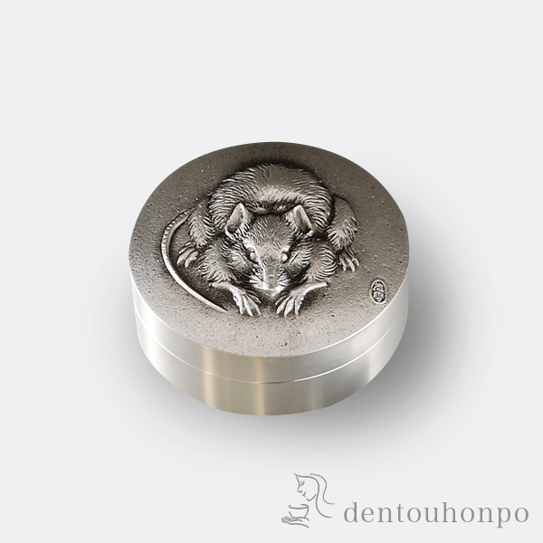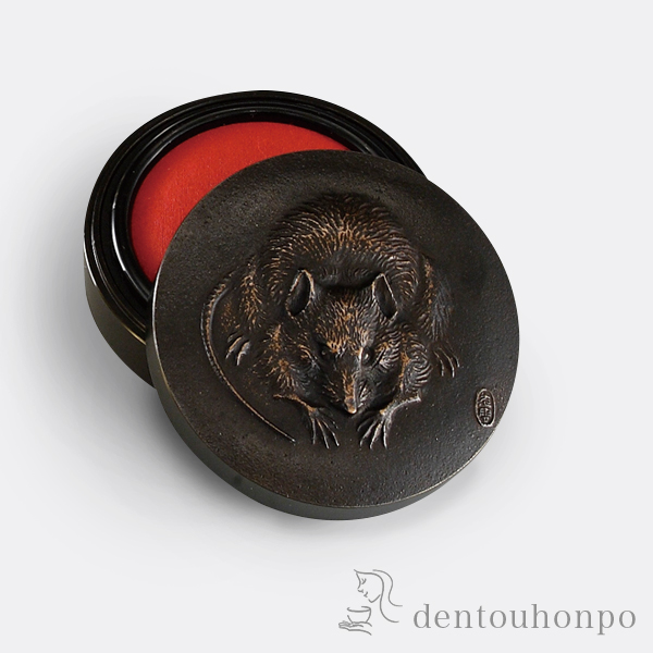 明治時代に活躍した高村光雲原型の朱肉池です。子(ねずみ)の造形は神秘的な美しさで、本体には重厚感があります。ご自分用にも贈り物にもおすすめです。
