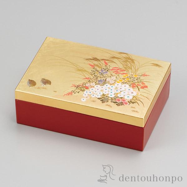 秋草の定番である「きく、ききょう、おみなえし」などの多彩な花を、カラフルな色使いで明るく仕上げました。特に蒔絵を織り交ぜ10回近く重ねた山中漆器のスクリーン技術は美しいの一言では言い表せません。