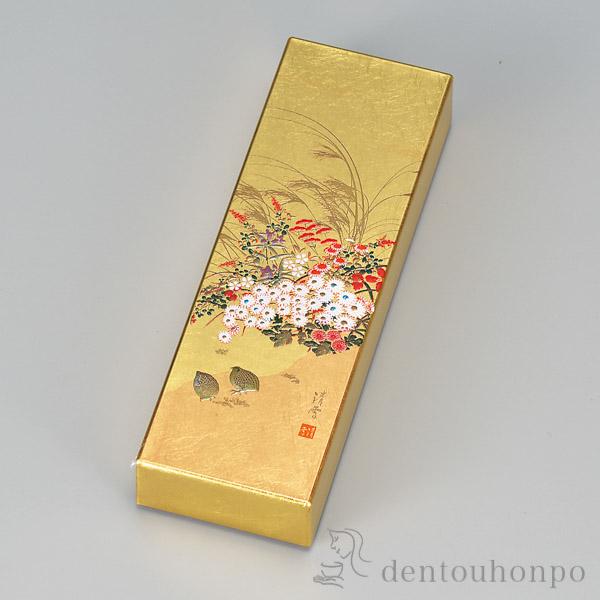 秋草の定番である「きく、ききょう、おみなえし」などの多彩な花を、カラフルな色使いで明るく仕上げました。特に蒔絵を織り交ぜ10回近く重ねた山中漆器のスクリーン技術は美しいの一言では言い表せません。
