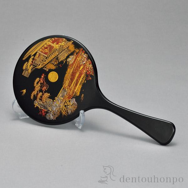 手鏡 初音 黒 スタンド付 ( 名入れ有料 退職祝い 定年 ハンドミラー コンパクト お土産 記念品 アンティーク 山中漆器 結婚 出産 )