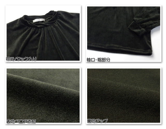 | 特長 | ・長袖プルオーバー ・ベロア素材 ・襟元タック入り ・無地・婦人 ・レディース |