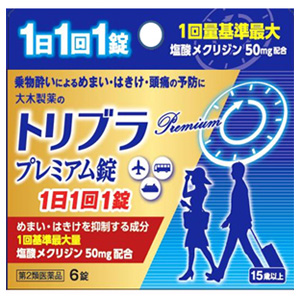 ●めまい・吐き気を抑える有効成分の塩酸メクリジンを1回基準最大量50mgを配合。吐き気抑制のスコポラミンも1回最大量配合。眠気・部痛を抑えるカフェインと神経機能を清浄に保つビタミンB6を配合したプレミアム処方の酔い止め薬です。