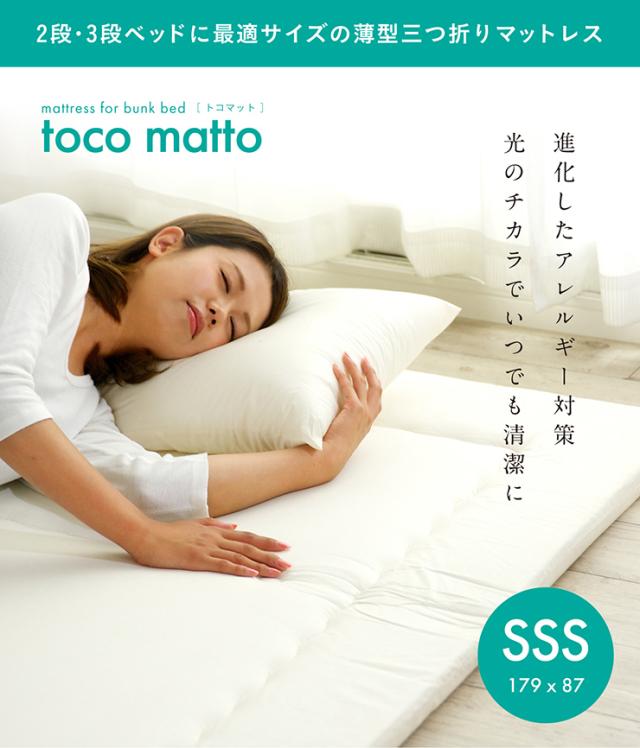 【日本製/2段・3段ベッドにぴったり】マットレス マット シングルスリムショート サイズ 三つ折り 折りたたみ 二段ベッド用 三段ベッド用 ロフトベッド用 システムベッド用 光触媒 toco matto(トコマット) SSS 5色対応