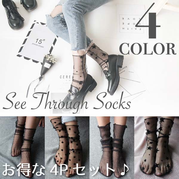 靴下 シースルー フロッキー ソックス シアー ルーズソックス チュール オーガンジー 透け素材 透け感 今コレ 送料無料 880601-4P