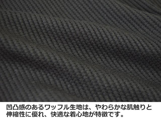 ■ワッフル生地の大きな特徴が、生地の凸凹により吸収性に優れ、汗をかいてもベタ付かず、また逆に空気を含む事で保湿性を高める効果もあります。