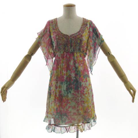 【中古】グレースクラス ワンピース フレアスリーブ ひざ丈 シルク リーフ柄 ミントグリーン ピンク マルチカラー 36