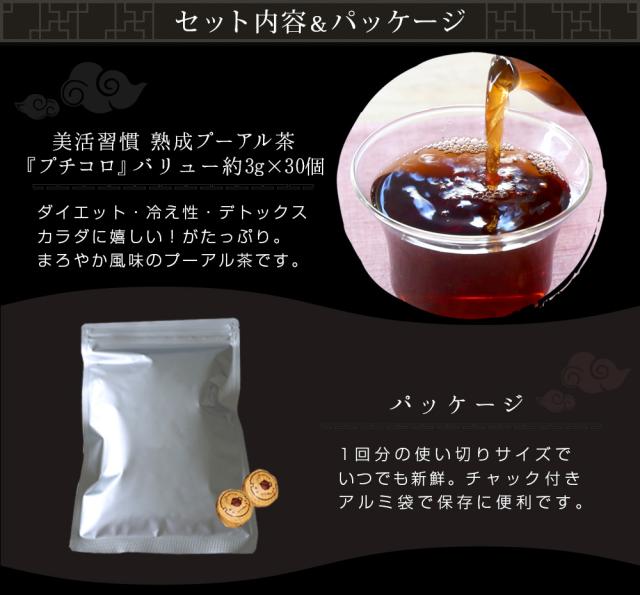 ●商品名:美活習慣 熟成プーアル茶「プチコロ」バリューサイズ ●内容量:約2.5〜3g粒タイプ(包装紙込) ×30個入