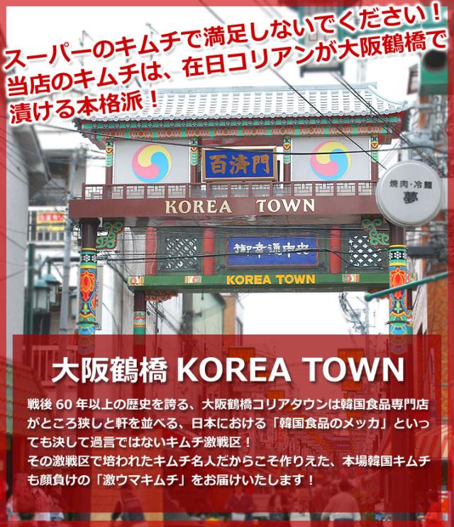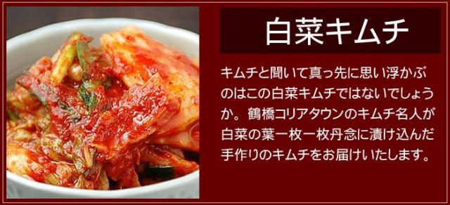 50年以上の歴史を持つ、大阪鶴橋コリアタウンの本格手作りキムチ。定番の白菜・大根・胡瓜キムチをセットでお届け致します。辛いだけではない、コクのあるヤンニョムをお楽しみください。