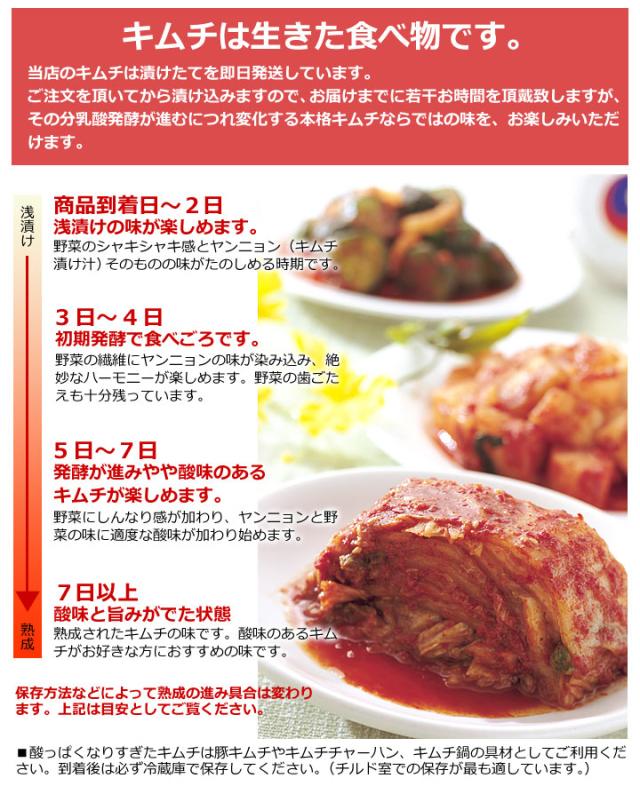 【賞味期限】白菜・大根キムチ:冷蔵14日、胡瓜キムチ:冷蔵10日