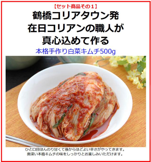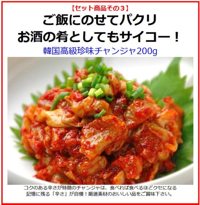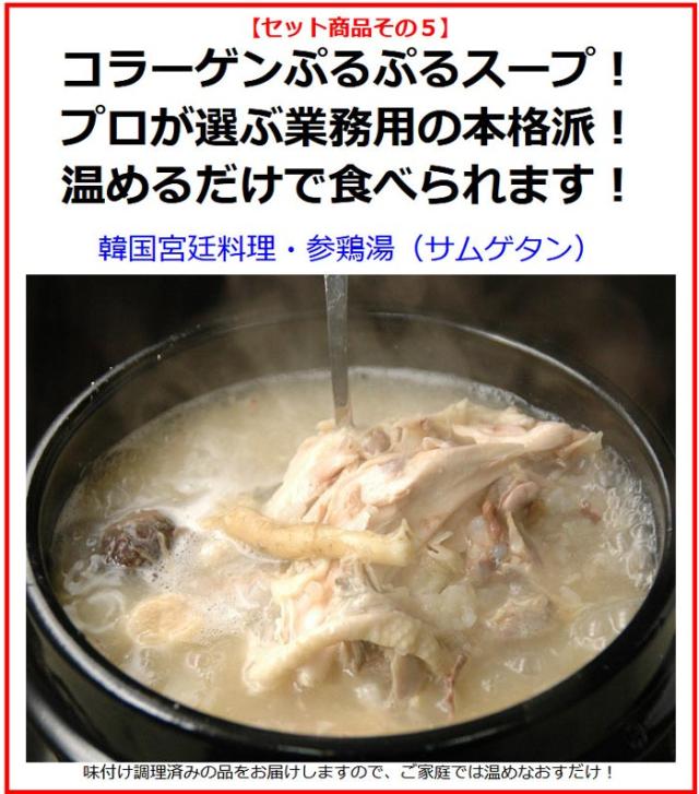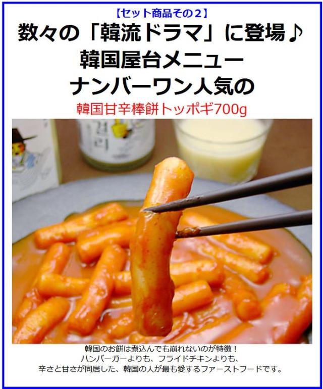 【商品内容】白菜キムチ500g、韓国甘辛棒餅トッポギ700g、韓国高級珍味チャンジャ200g、参鶏湯1kg(レトルト)、韓国冷麺2食