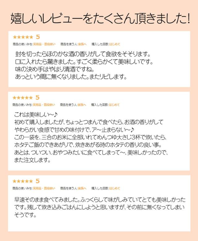 | 原材料 | 帆立貝柱(国内産)、砂糖、清酒、食塩、醤油風調味料、米発酵調味料、醤油/ソルビトール、トレハロース、調味料(アミノ酸等)、酸味料、メタリン酸Na(一部に小麦・大豆を含む) |