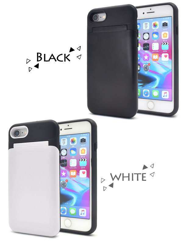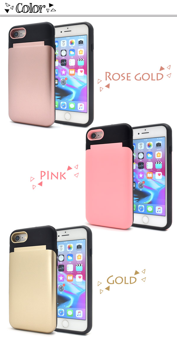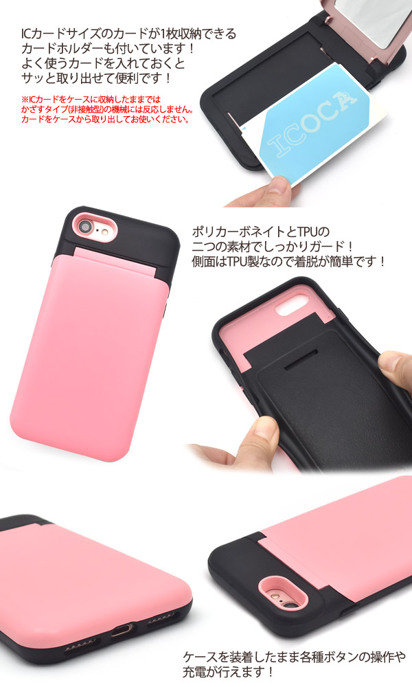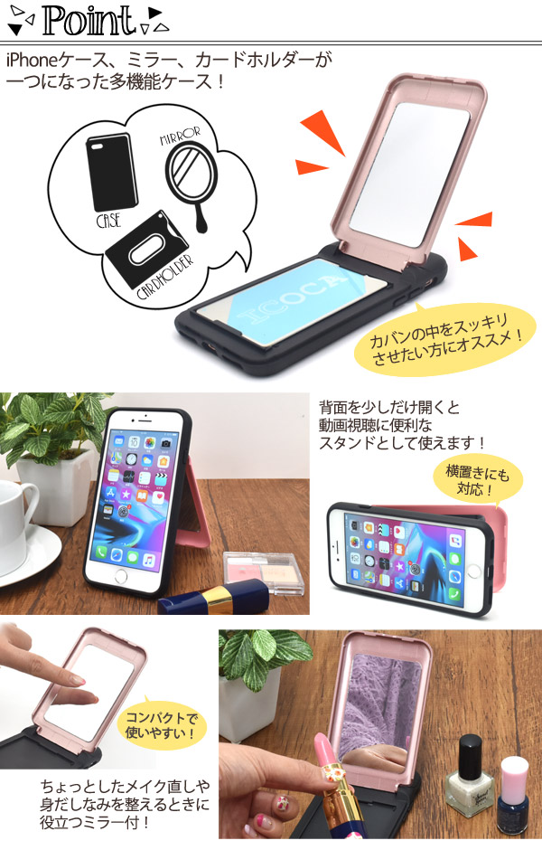 ミラー、カードホルダー、iPhoneケースが一つにまとまった多機能ケース!カバンの中をスッキリさせたい方にオススメ!スタイリッシュなツートンカラーがオシャレなアイテムです。 背面の蓋を開くと、メイク直しに役立つミラーと、ICカードサイズのカードが一枚収納可能なカードホルダーが付いています。ポリカーボネイトとTPUの二つの素材で衝撃やキズなどからiPhoneをしっかりと守ってくれます。 側面はTPU製なので着脱も簡単です!※iPhoneは付属しません。※ライセンス商品ではありません。※フラッシュを使用して撮影をするとケースの色が写りこみます。