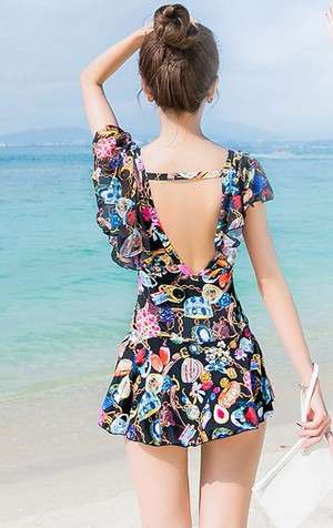 ワンピース水着 スイムウェア ビーチウェア フリルショルダー フレア 総柄 チェーン 背中見せ 大人可愛い ネオカラー エレガント