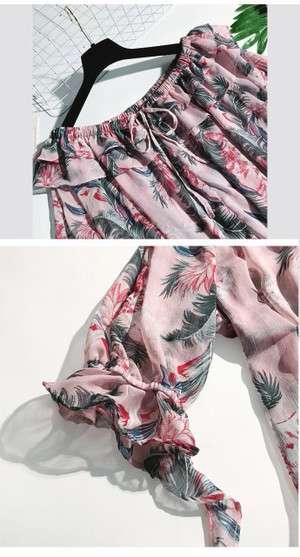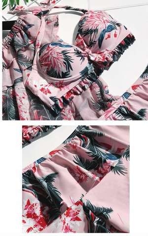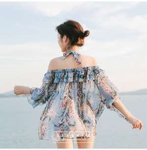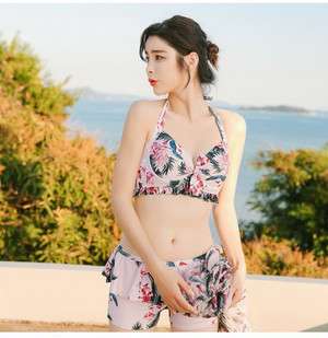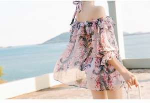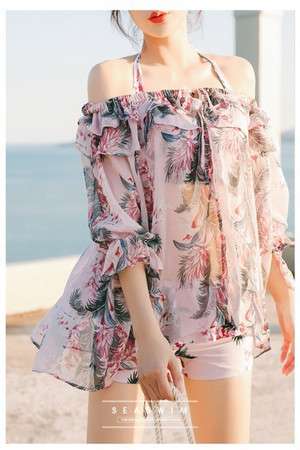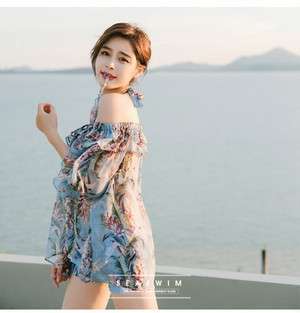 体型カバー 水着 ビキニ ビスチェ 3点セット 大きいサイズ レディース 2019年新作 ビーチウェア 40代 30代 20代 フレア シフォン ブラウス オフショルダー フリル セットアップ 花柄 ボタニカル柄 透け感 カバーアップ 着やせ 韓国 ママ水着 オシャレ XL XXL 海 プール