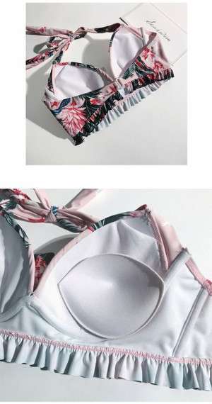 シンプルなビキニトップスとフリル使いの効いたボトムのセットに加え、