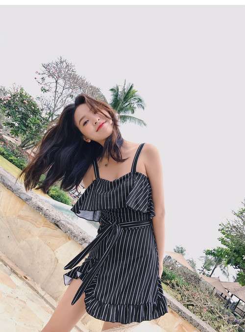 ウエストのリボンや胸元のフリルなど可愛さもありつつ、露出を抑えたデザインです♪