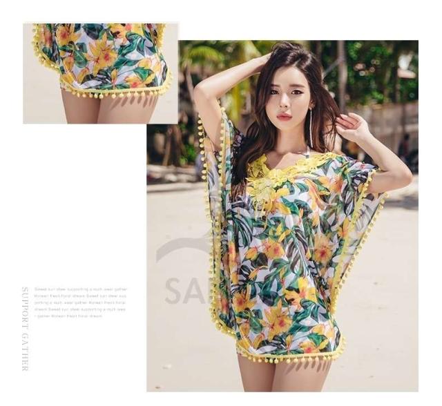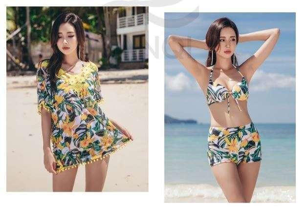 体型カバー 水着 ビキニ 3点セット 大きいサイズ レディース 2019年新作 ビーチウェア 40代 30代 20代 ビッグTシャツ タッセル 総柄 花柄 セットアップ カバーアップ ゆったり ホルターネック ショートパンツ 着やせ 韓国 ママ オシャレ XL 海 プール マリンスポーツ