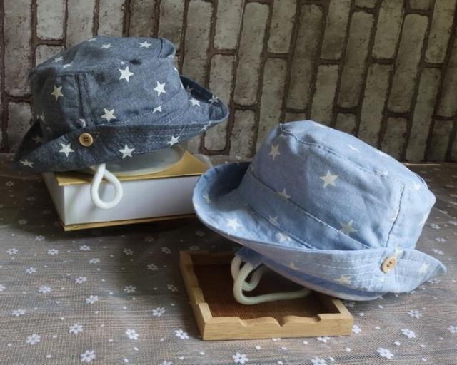 ☆可愛い星柄デニム調ベビーハット・風に飛ばない紐付♪♪