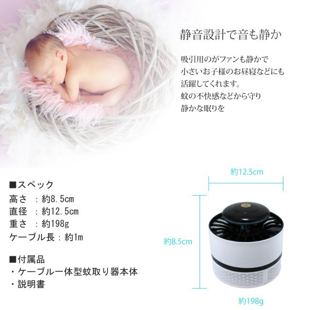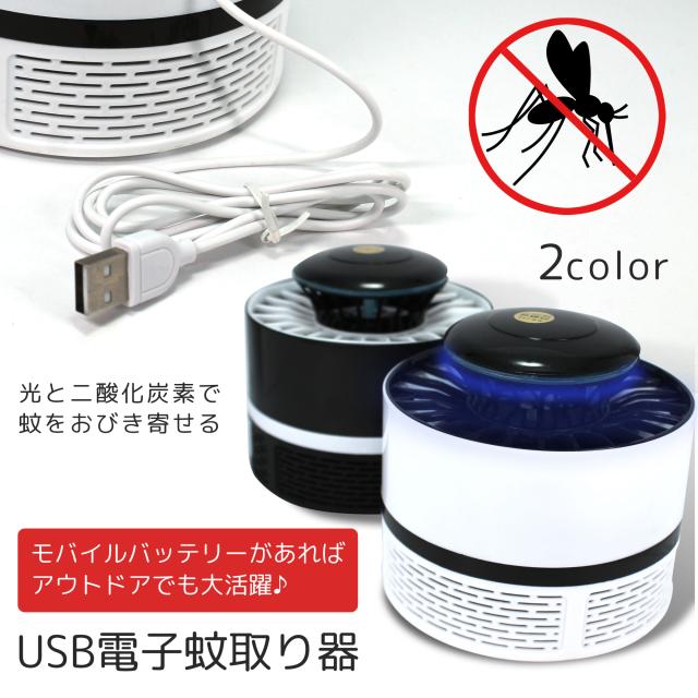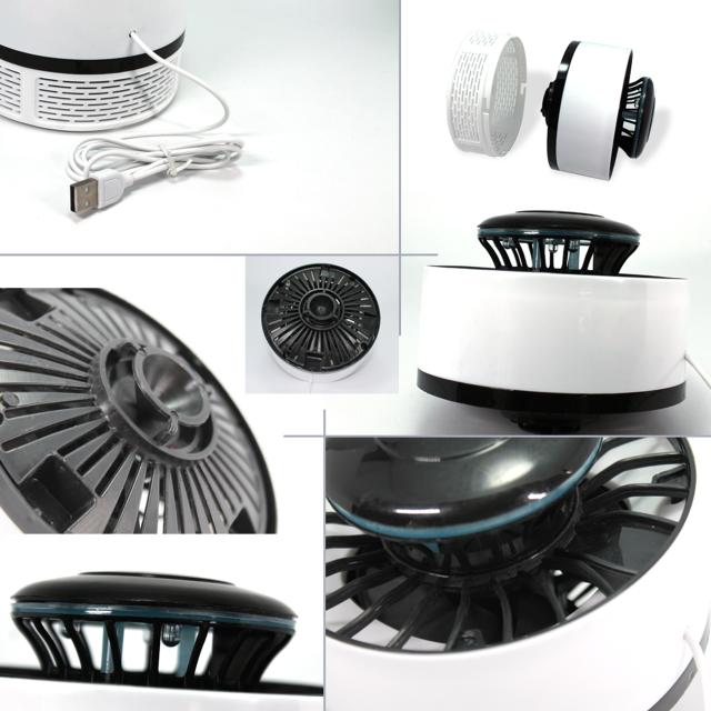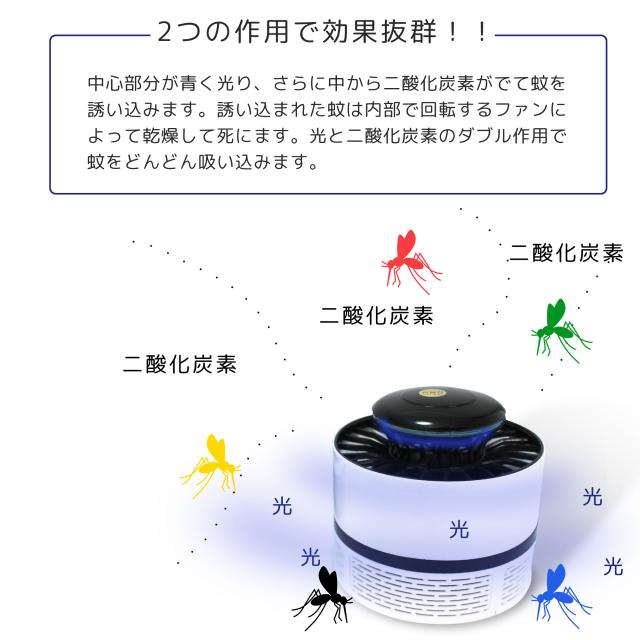 ・誘虫効果のある青い光と二酸化炭素を放出して蚊をおびき寄せ、内部の吸引ファンで吸いこむUSB式電子蚊取り器です。