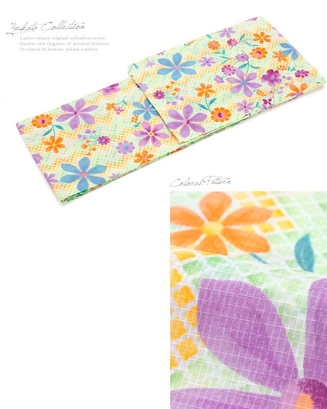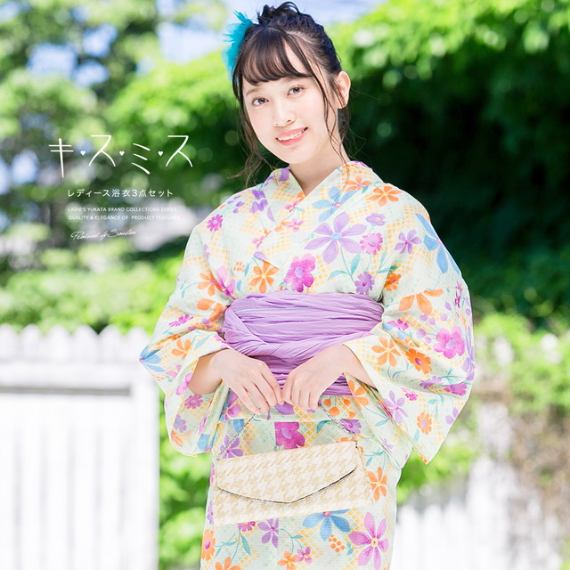 浴衣セット レディース レトロ 浴衣セット 大人 3点セット 緑 グリーン 紫 クレマチス 花 変わり縞 綿 紅梅織 兵児帯 女性 キスミス