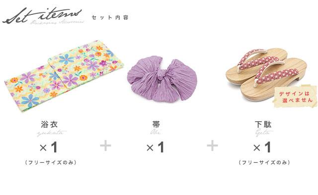 こちらの商品は、浴衣・帯・下駄の3点セットです。セット内容の一部変更や、それに伴う値引きは承っておりません。