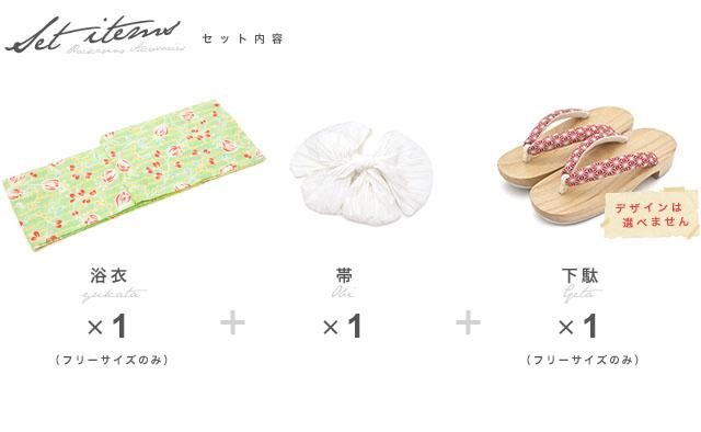 こちらの商品は、浴衣・帯・下駄の3点セットです。セット内容の一部変更や、それに伴う値引きは承っておりません。