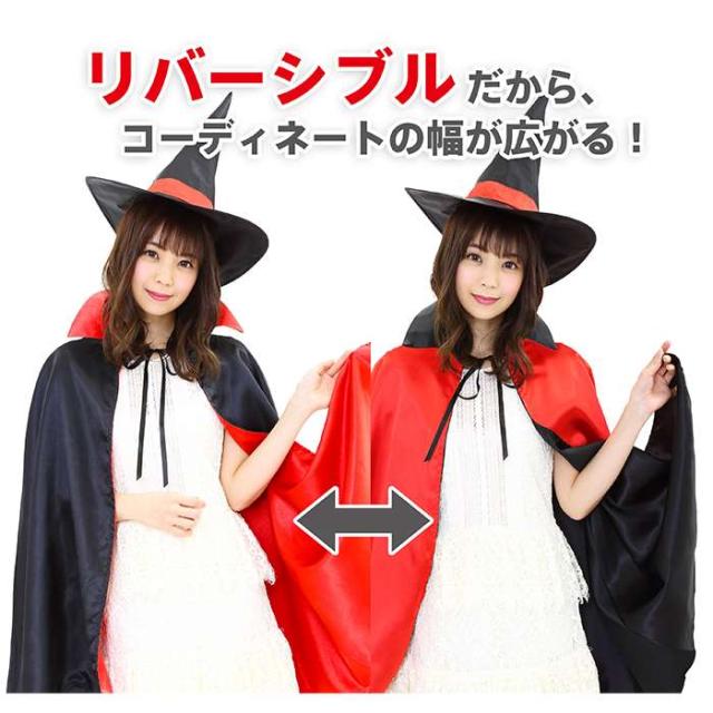 お手持ちの洋服に羽織るだけで魔法使いに大変身。リバーシブルだから組み合わせは無限大。子供サイズもあるから親子でおそろいも可能。ドラキュラやメイドなど、どんなコスとも相性バッチリ。